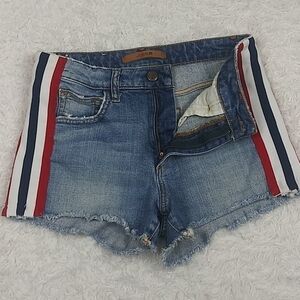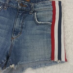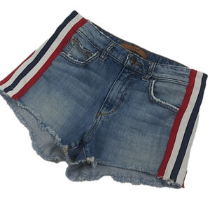 Joe's Women's Five Pocket Medium/Light Wash Distressed Mid Rise Frayed Hem Blue Jean Shorts. 92% Cotton, 2% Polyurethane. Button/ Zipper Front Closure. Red/White/Blue Knit Side Hip Panel Details. Measurements approx. Flay Lay. Waist: 14, Hips: 16, Rise: 9.5, Inseam: 3,