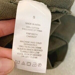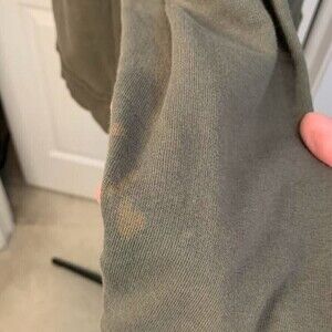 Note that there are faint marks/bleach stains on back on arm and small stain on front of shirt