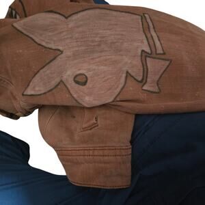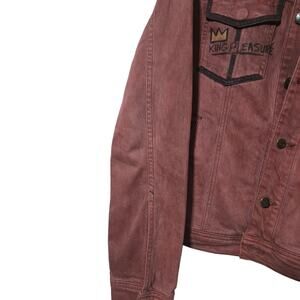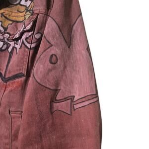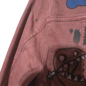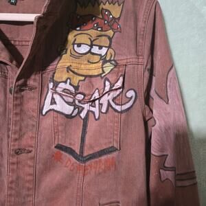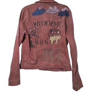 Make a statement with this unique Joe's brand denim jacket in size Medium. It features bold, hand-painted graffiti-style artwork that includes Bart Simpson, KAWS-inspired clouds, money bags, and a Brooklyn 1996 street motif. The jacket has a washed red base and showcases original custom artwork on both the front and back, making it a perfect choice for fans of streetwear and pop culture mashups.