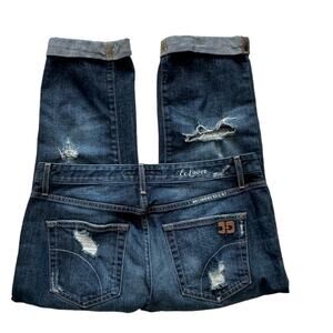 Stylish dark blue cropped jeans. Distressed details. Perfect for casual wear.