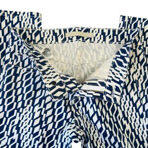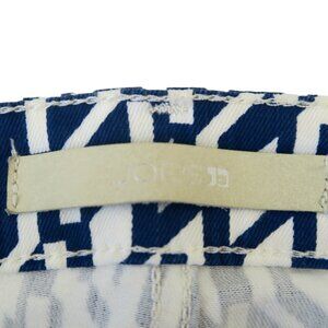 These Joe’s Jeans feature the High Water fit in a striking Royal Diamond pattern—blue and white with a crisp ankle-length cut. They’re marked size 25 and offer a classic 5-pocket design with a zip/button fly. The fabric blend includes cotton, lyocell, rayon, polyester, and a touch of spandex for comfort and structure. Approximate flat measurements: waist 13.5", hips 16", rise 8.25", inseam 26.5".