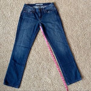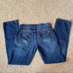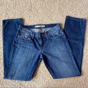 Joe’s Jeans 100% cotton Lucas wash denim. Size 26. These are in great condition with little signs of wear. Cute fading look and hidden zipper back pockets.