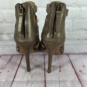 Leather upper with man made sole. Heel measures approx 4" H. Woven front detail. Chmmet color - nice metallic gold color.