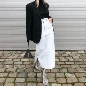 Effortless and timeless, this white denim skirt is crafted from 100% cotton with a flattering A-line silhouette, raw hem, and below-the-knee length. A true wardrobe staple—perfect for summer or styled year-round: dress it up with a blouse and heels or keep it casual with a tee and sneakers.
