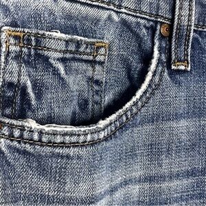Preowned with minor flaws noted with increased distressing along lower leg hems, and small discolored spots on the back left pocket/leg. Please refer to all pictures for details.
