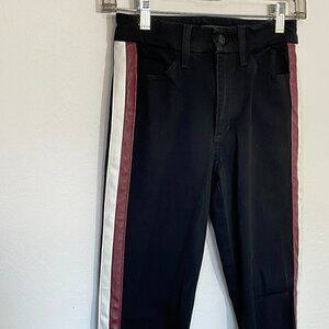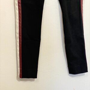 Jeans are black in color with Red/White faux leather stripes down sides, Button and zip front, Pockets, Skinny Ankle, Logo.
