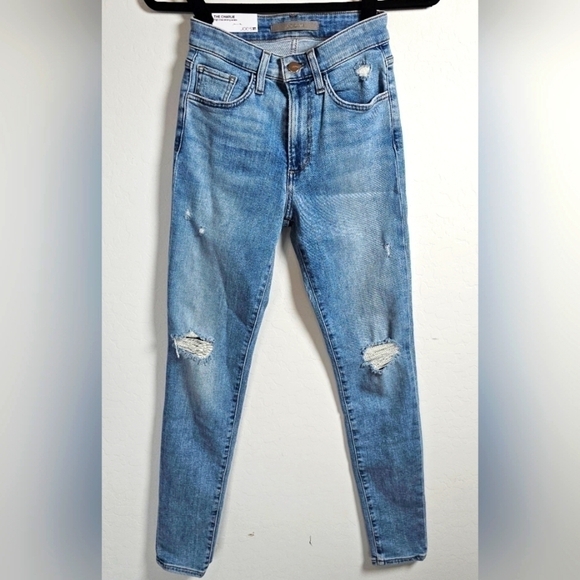* Features: Ripped knees, high rise, skinny ankle, light wash
