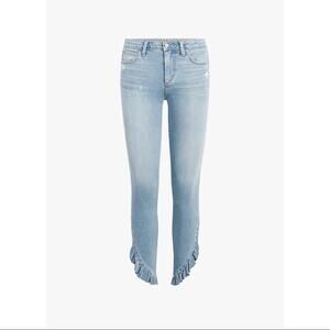 Joe’s Jeans Icon Ankle in Percy. Cropped skinny jean styled with a medium rise and curved ruffle hem. The pair has a comfy feel, crafted from stretch denim featuring a light-blue stone wash with faded character. Light distressing throughout.