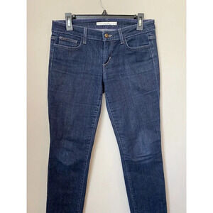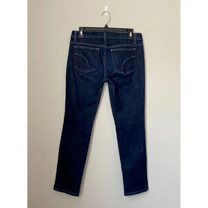 Joe's Jeans Women's 27 Cigarette Fit Ankle Straight Dark Wash Denim Blue Jeans are a slimming, shaping, and comfortable pair of jeans made of a cotton blend with elastane. They feature a 5-pocket design, coin pocket, button and zipper closure, and a mid-rise of 8.5-10.5 inches. The jeans have a straight narrow leg style and an inseam of 28.5 inches. They are suitable for all seasons and come in a dark wash blue color. The jeans are branded with Joe's Jeans logo and are machine washable.