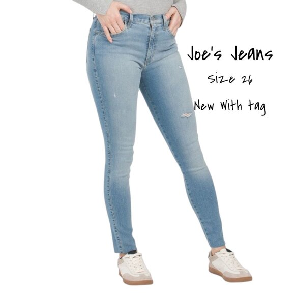 Women’s Joe’s Jeans mid-rise straight ankle style features distressed accents, raw cuffs, and a comfortable stretch fabric. Designed with an ankle-length straight leg, five-pocket style, and a zip fly with button closure, they’re made from 98% cotton and 2% elastane. In a classic blue color, size 26 with a 28-inch inseam, these jeans are brand new with tags and retail for $198.