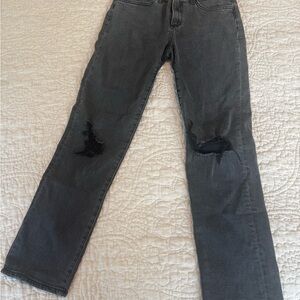 Stylish straight leg jeans. Dark gray color. Perfect for Fall! Dress up or down , looks great with white or burgundy tops !