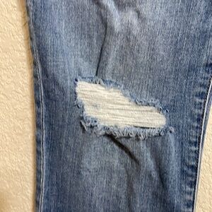 Stylish straight leg jeans. Distressed detailing. Classic blue color. Perfect for casual wear.