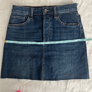 A raw hem elevates this classic stretch-denim miniskirt cast in a dark-blue wash with subtle whiskering. Zip fly with button closure Five-pocket style 99% cotton, 1% spandex Machine wash, tumble dry Imported