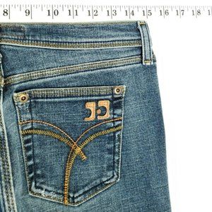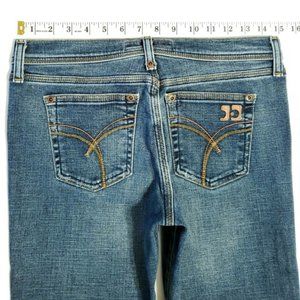 High-end designer jeans by Joe's Jeans. Low rise boot cut, featuring raw hems, yellow stitch trim, and unique rear pocket designs. Faded medium blue stone wash.