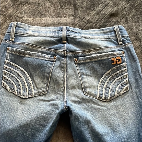 Stylish blue denim jeans with unique back pocket design. Perfect for casual outings.