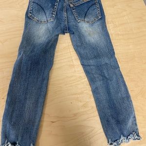 From brand website: She may not be a rock star yet, but she can look the part in these mid-rise stretch-denim skinnies grunged up with modern fading and tattered hems.