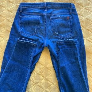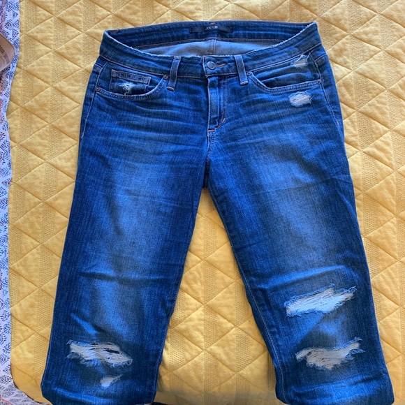 Soft and a little spandex. Knee holes have been patched so they'll last forever! Joe's Jeans "The Skinny".