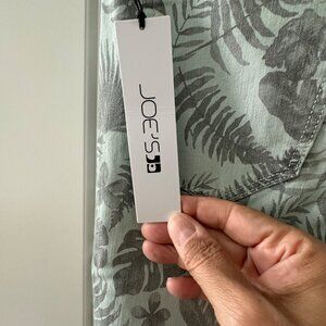 Joe's The Icon Mid Rise Skinny Crop Jeans showcase a stylish tropical leaf pattern in green and gray. Meticulously crafted with attention to detail, these jeans provide a flattering fit for every body type.