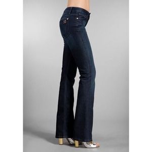 Heavier-weight stretch denim in a dark, subtly faded rinse features a modern, higher rise and a boot-cut leg. Signature leather logo patch brands one of the tonally embroidered back pockets.