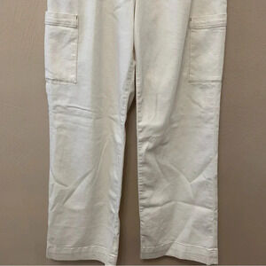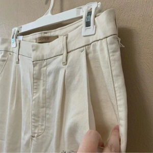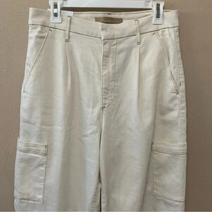 effortlessly cool, wide leg pant has a high rise and wide hem with front pleats and trouser pockets. The natural shade is finished with a deep hem and cargo pockets.