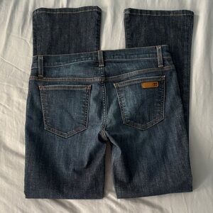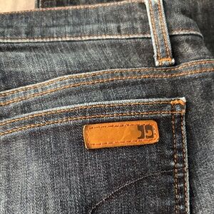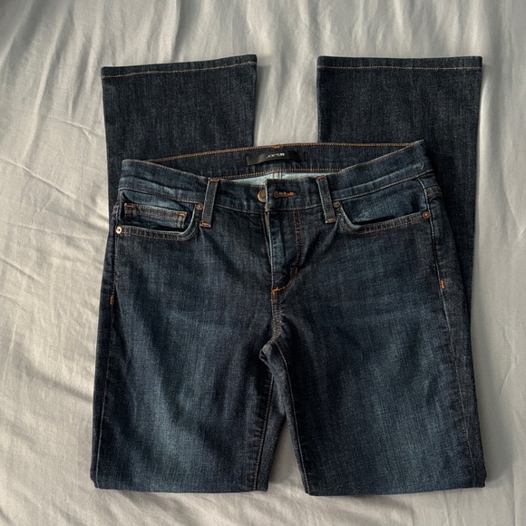 Stylish indigo denim jeans by Joe's. Features orange stitching and classic button closure. Perfect addition to any closet