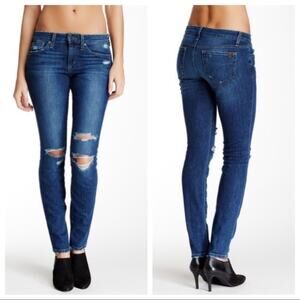 Joe’s The Skinny Jeans Vidika Size 26. A Medium wash stretch denim skinny jeans with shredded knees and light whiskering. Zip fly with button closure-five pockets construction. Fading and whiskering. Distressed details. Please see the photos for more details and measurements. Smoke and Pet free home. Thank you so much for looking!