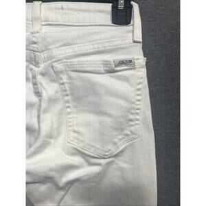 The product is a pair of Joe's Mid Rise Skinny Ankle White Size 24 Woman Jeans Pant. These jeans feature a solid white color, a cotton blend fabric with a denim texture, and a mid-rise fit. The jeans have a zip and button closure, a 5-pocket design, and a raw hem accent. With a bohemian and hipster theme, these jeans are versatile for the summer, fall, and spring seasons. Easy to care for with machine washable instructions, they offer a stretchy and comfortable fit for a stylish look.