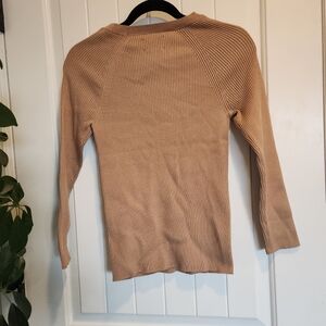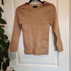 Gorgeous tan ribbed sweater by Joe's jeans. New with tags. Caramel color. Shoulder to sleeve hem is 23", armpit to armpit is 13", armpit to hem 14.25", collar is 8.75" at the top of the neck.