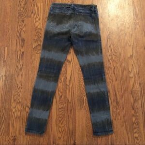 Neutral dip dyed tie dye horizontal striped skinny jeans. Horizon is the color name which is brown / gray / blue.