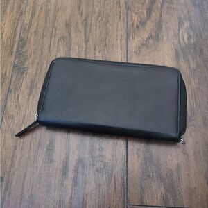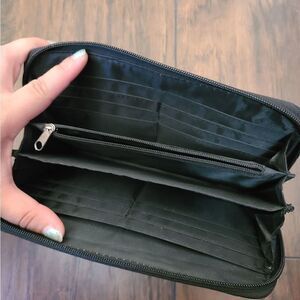 This is a black zippered wallet by Joe's Jeans. It has many credit card pockets and an inner zippered pocket. On the wallet is a small metallic plate with the brand logo.