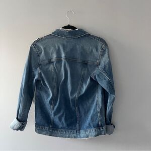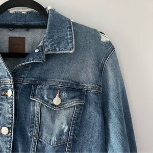 Classic denim jacket with button front closure. Distressed denim. Cotton blend with a little stretch. Size XS