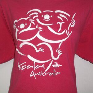 This adorable graphic t-shirt is pre-owned but is still in very good condition with lots of wear left. Features Koalas of Australia graphic design. Joey Roo Australia. Made by Bobby Oz. Size Medium. Color is pink.