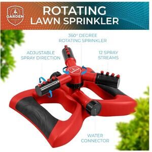 * The Joeys rotating sprinkler is a sturdy, lightweight, and adjustable lawn sprinkler designed for outdoor use. It features three fully adjustable arms, allowing you to customize your spray pattern to suit your area and distance. The sprinkler also has an extension option for larger yards, allowing you to connect multiple sprinklers to expand the area and distance.