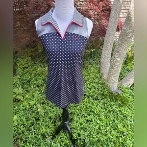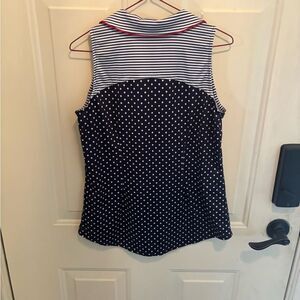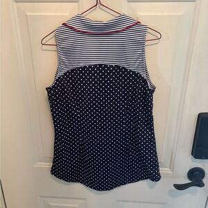 Stylish navy sleeveless top with white polka dots. Features a striped collar and red trim. Perfect for casual outings.