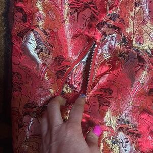 Vibrant red bomber jacket with gold accents. Eye-catching design. Perfect for standout style.