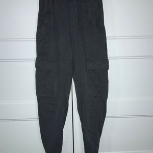 Dark grey color w/ cargo pockets. Thick, warm material, very good condition.