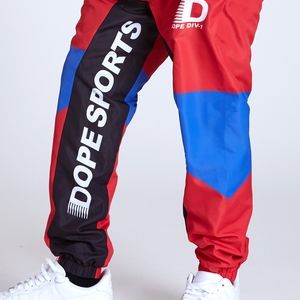 Division Track Pant by DOPE. Polyester windbreaker jogger pants with paneled construction. Self elastic drawstring waist , elastic ankle cuffs, two front welt hand pockets and single welt back pocket with woven label detail. Fine mesh lining.