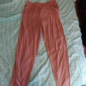 Peach colored jogging pants. Really comfortable and fits multiple waist sizes.