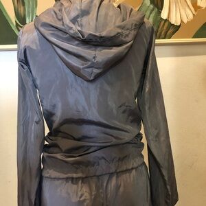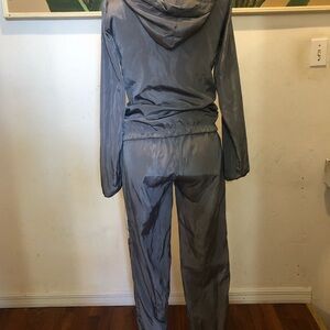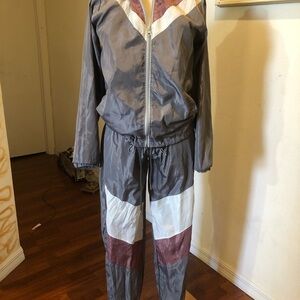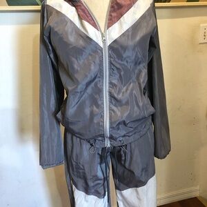 Multicolored jogging suit, size Small. Pants and Jacket, color gray, pink and white. 100 polyester, the jacket has two side pockets and front zipper. The pants has a elastic waistband.