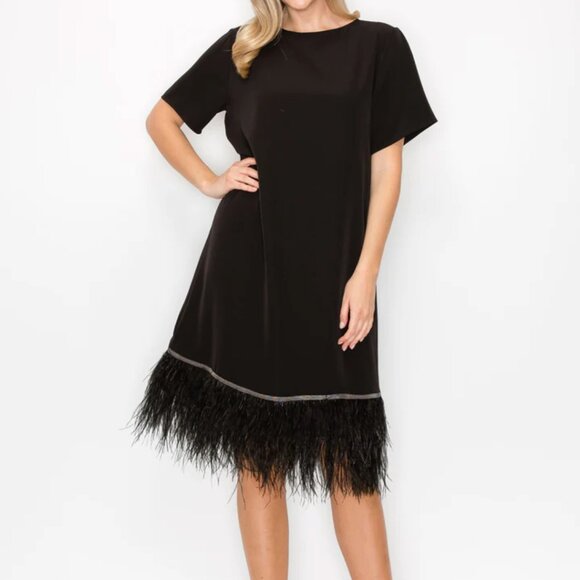 Description: The perfect black dress. Made beautifully with crepe de cine fabric. Feathers around the bottom with beading strip. Round neck and short sleeves. Stylish and elegant. Easy relax fit. Lined.