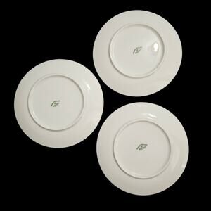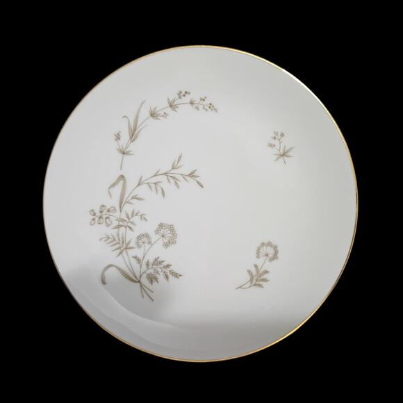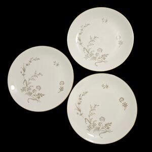 Set of three 6-inch Johann Haviland Bavaria plates featuring a delicate taupe botanical design with gold trim. Classic white porcelain with elegant floral linework. These vintage pieces display beautifully and work well as bread, dessert, or small salad plates. Light surface wear from age and storage but no cracks or major structural damage. Clean and ready for use or display. See photos.