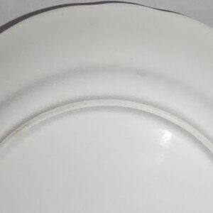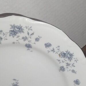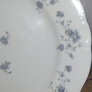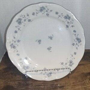 Porcelain dinner plate in the Blue Garland pattern by Johann Haviland. It was made in Bavaria Germany. The plate measures approximately 10 inches across. It has small blue flower on a white background with platinum trim. There is minor wear from use. The back stamp reads Johann Haviland, Bavaria Germany. It was produced between 1974 - 1990.