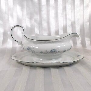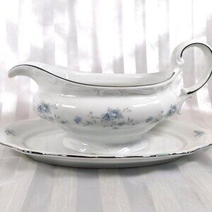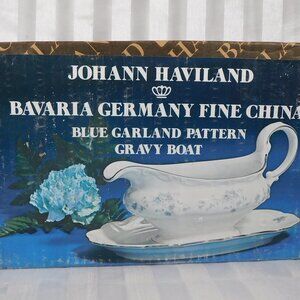 This is a Johann Haviland gravy boat in Blue Garland with a Bavaria backstamp that comes with the original box. I do not know if the gravy boat is new or used. This pattern is dated 1974 and it is white with small blue flowers and platinum trim. The box is not dated, but has an original price tag of $ 15.99.