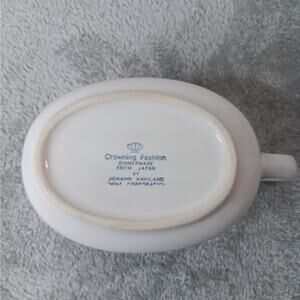 Vintage Johann Haviland Crowning Fashion Golden Band Gravy Boat with Underplate. Plate measures approximately 8 3/8" x 3 3/4". Stoneware. Made in Japan. Preowned excellent condition with no chips, cracks or crazing. Shelf/table wear on bottom rims. From a non-smoking home.