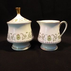 Johann Seltmann Vohenstrauss Sugar n Creamer w Lid Green Floral Gold Trim