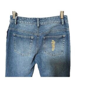 Features high-rise, zip fly with button closure, 5-pocket design, belt loops, frayed side details, mushroom stitch at back pocket, and straight leg. Style P450JN. New without tags.
