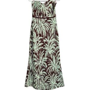 This strapless dress from Johanna Ortiz features a striking palm print in mint green over a rich, chocolate brown background, tailored in a form-fitting silhouette. The bodice is shaped with sculpted bust and defined by a slim waistband, creating a clean, elegant line. Tightly pleated fabric adds texture and movement throughout, giving the tropical pattern added depth and dimension. Back zipper. Lined.