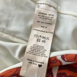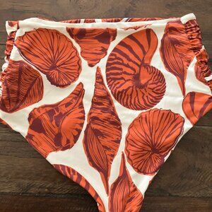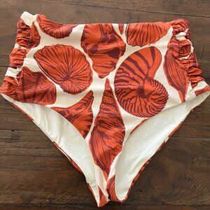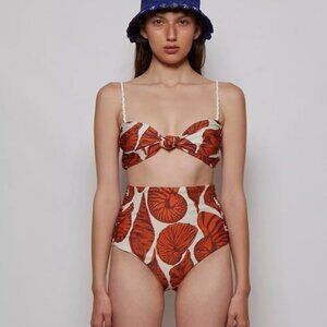 Stylish bikini with bold orange floral patterns. High-waisted design. Perfect for beach days.