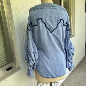 Check out the pictures. This blouse is in very good condition, but one of the eye hooks that I show in pictures could be stitched if necessary. Content label is no longer there, but it is a cotton blend/denim like.