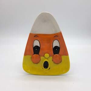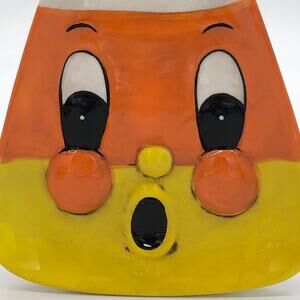 One new Johanna Parker Transpac Candy Corn shaped Fall Halloween plate with a surprised face. Plate measures approx 8.25”h and approx 6.25”w at the widest point across.